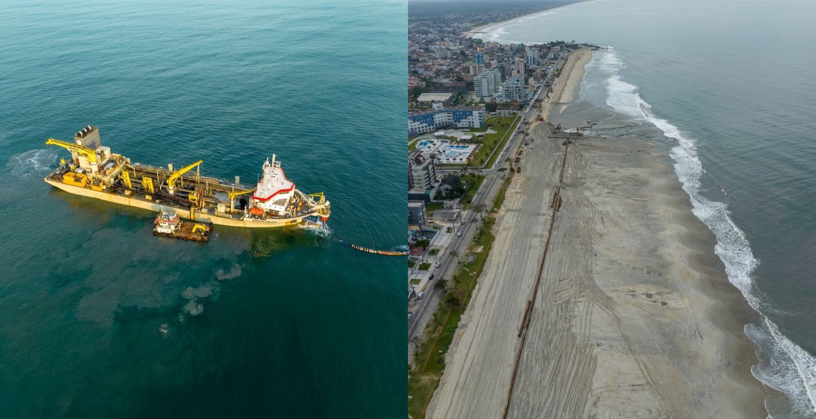 Obra inédita no Brasil vai usar areia de dragagem de canal para alargar faixa de praia A draga Galileo Galilei, embarcação usada nos trabalhos de alargamento da Praia Central de Balneário Camboriú, concluídos em 2011, chegou a Itapoá (SC) na sexta-feira (3). O equipamento será usado para uma megaobra: ampliar em pelo menos 30 metros a faixa para banhistas e na dragagem do canal de acesso aos principais portos do Norte de Santa Catarina. O novo serviço será inédito no país. A informação sobre vinda da draga foi confirmada em setembro e agora, o início da dragagem depende da autorização ambiental do Instituto Brasileiro do Meio Ambiente e dos Recursos Naturais Renováveis (Ibama). ✅Clique e siga o canal do g1 SC no WhatsApp Relembre métodos usados para alargar praias em SC antes de obra inédita no país Entenda como obra vai usar areia removida de canal para alargar praia em SC O trabalho, realizado por meio de uma parceria entre o governo estadual e a iniciativa privada, prevê a retirada de 12,5 milhões de metros cúbicos de areia do fundo da Baía da Babitonga. Desse total, 6,4 milhões serão depositados na orla de Itapoá, que sofre com a erosão causada pelo mar. O restante será transportado para uma área de descarte em alto-mar, conhecida como “bota-fora”. Com a autorização, a preparação da tubulação será finalizada e, em cerca de dez dias, deve começar a dragagem no canal externo do porto. A draga é do tipo hopper e tem capacidade de cisterna de 18 mil m³. A intervenção é realizada no Porto de São Francisco do Sul, em parceria com o Porto Itapoá. A expectativa é que o alargamento ajude a conter a erosão marítima e beneficie tanto a operação portuária quanto o uso da faixa de areia pelos banhistas. Alargamento nas praias Matinhos (PR), que também contaram com a atuação da draga Galileo Galilei. Jan de Nul/Divulgação Navios maiores e engordamento 🚢💥A obra de dragagem, que vai custar cerca de R$ 324 milhões, pretende aumentar a profundidade do estuário que dá acesso aos portos de Itapoá e São Francisco do Sul, permitindo a operação de navios maiores, com até 366 metros de comprimento. Atualmente, o limite é de embarcações de até 336 metros. Já o projeto de alargamento da faixa de areia vai ampliar a área disponível para os banhistas, ao longo de cerca de 10 quilômetros, entre a região da Figueira e o Balneário Princesa do Mar. Em alguns trechos, o engordamento da faixa pode chegar a mais de 100 metros. 📍Com 32 quilômetros de litoral, Itapoá faz divisa com o Paraná e tem diversas opções para banhistas e pontos turísticos à beira-mar. No fim de agosto, a cidade decretou emergência por conta dos estragos causados pela chuva e o aumento da erosão na área costeira. Mapa mostra como será a obra de drenagem de canal e alargamento de praia em SC Governo de SC/Dvulgação 🏖️🚜 Diferenças entre obras de Balneário Camboriú e Itapoá Obra em Itapoá ➡️ 6,4 milhões de metros cúbicos de sedimentos depositados na orla; ➡️ sedimentos retirados da dragagem do canal da Baía da Babitonga; ➡️ obra vai ampliar em pelo menos 30 metros a faixa para banhistas, em uma extensão de cerca de 10 quilômetros, entre a região da Figueira e o Balneário Princesa do Mar; Obra em Balneário Camboriú ➡️ 2,5 milhões de metros cúbicos foram depositados na orla da praia, segundo a prefeitura; ➡️sedimentos retirados de jazidas submarinas com uma grande draga; ➡️faixa de areia da Praia Central passou de uma média de 25 metros para 70 metros; VÍDEOS: mais assistidos do g1 SC nos últimos 7 dias